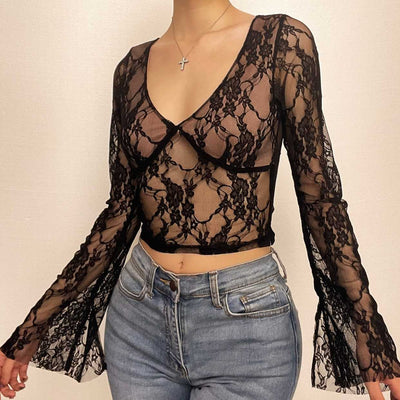 Flower applique hollow out ruched long flared sleeve cut out mini dress-final-sale