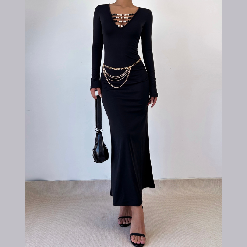 Long sleeve beaded v neck solid maxi dress | Festival Outfits Women