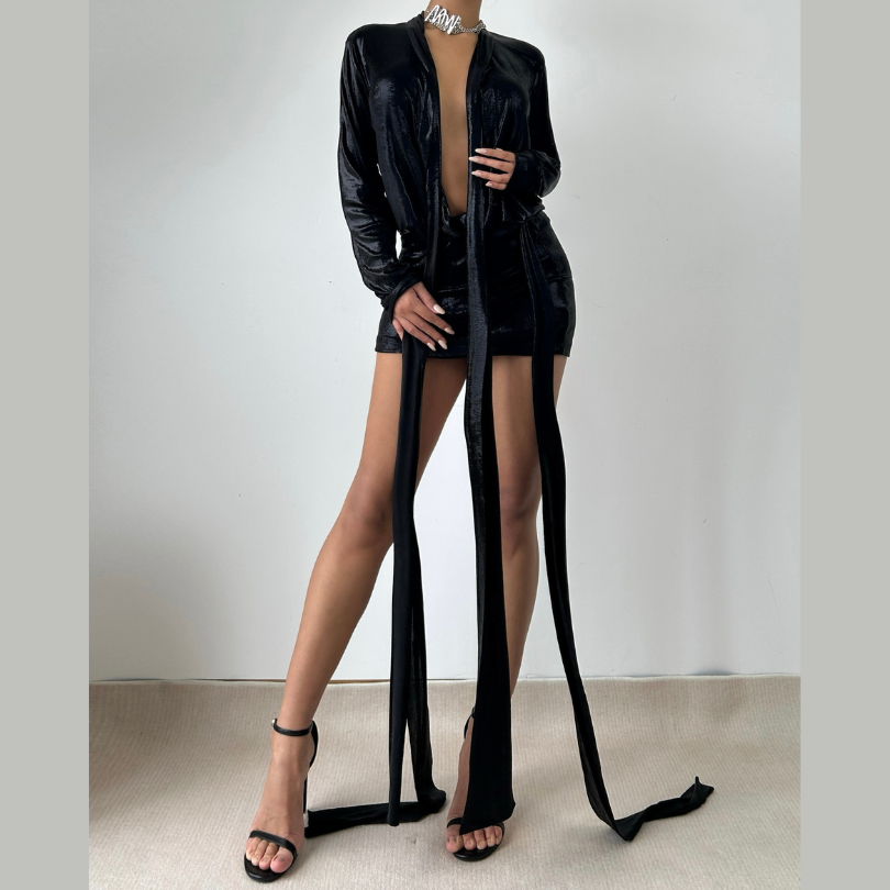 Long sleeve deep v neck metallic mini skirt set | Festival Outfits Women