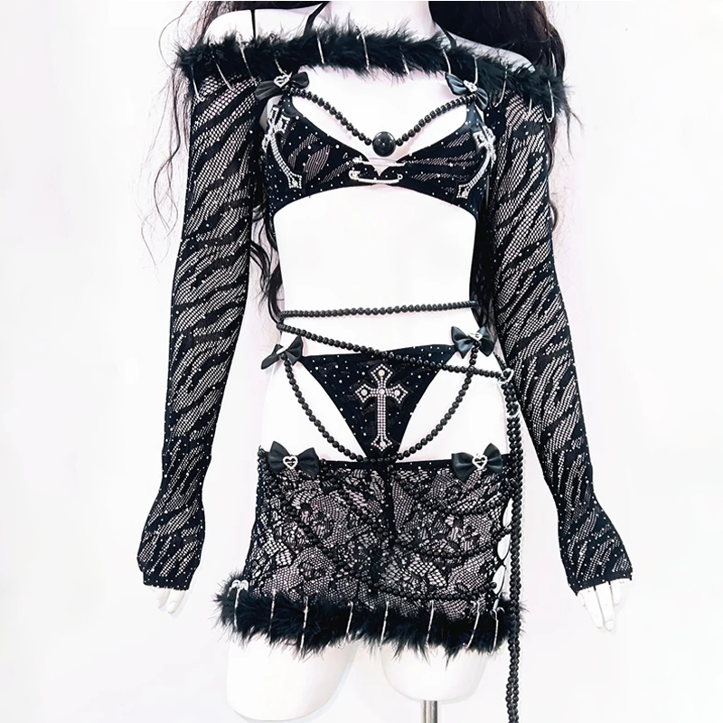 Beaded bowknot long sleeve off shoulder self tie mini skirt set