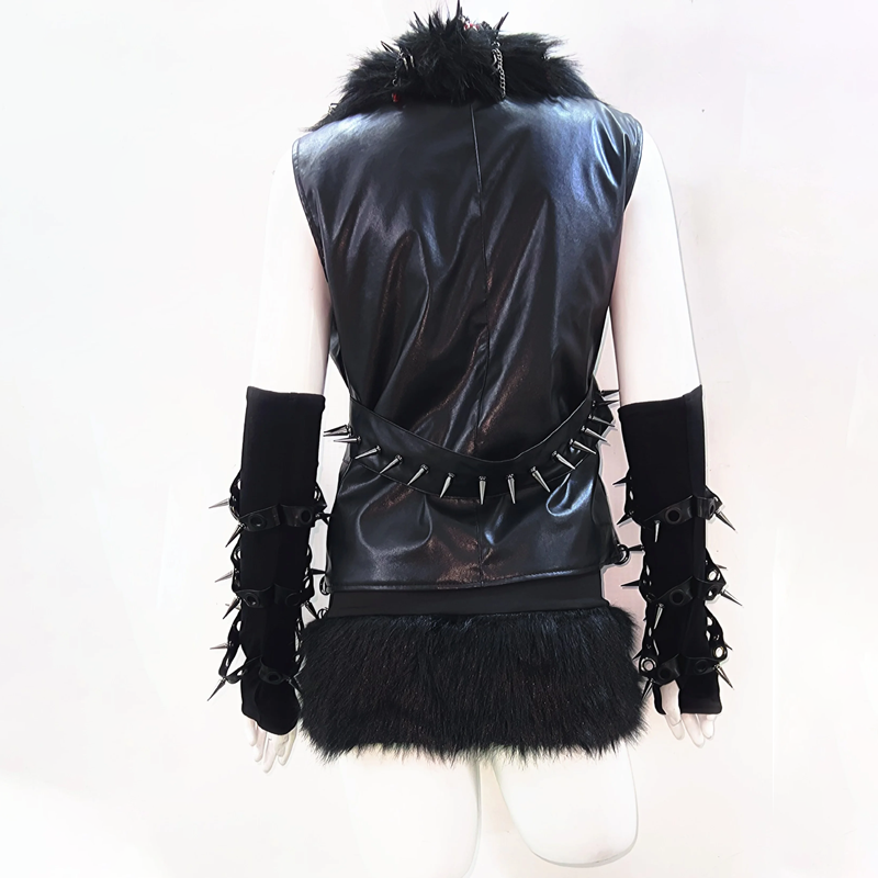 Fluffy rivet applique PU leather v neck o ring top