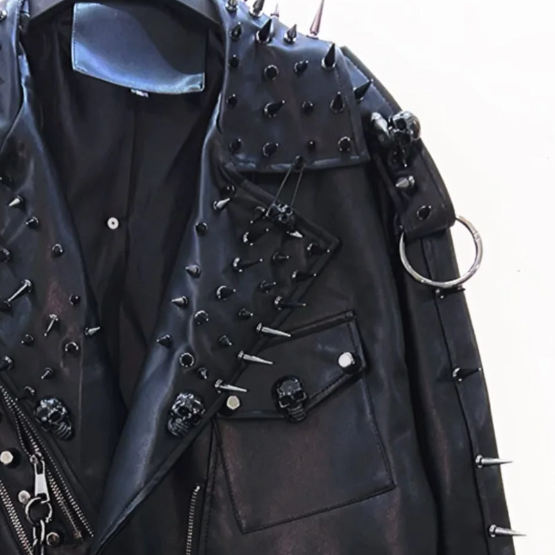 PU leather long sleeve zip-up rivet applique o ring top