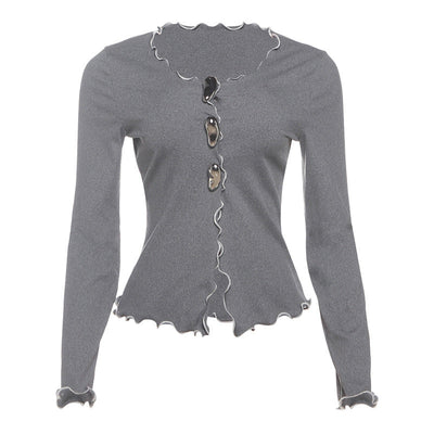 Long sleeve ruffle hollow out solid cut out top