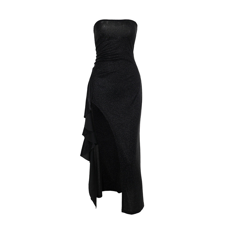 Glitter high slit ruffle tube maxi dress