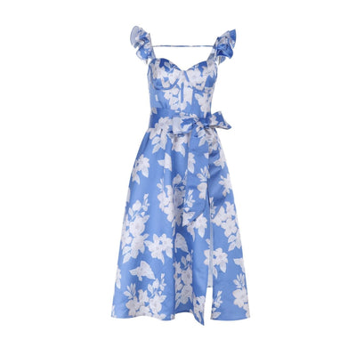 Lace hem slit v neck ruffle butterfly print maxi dress
