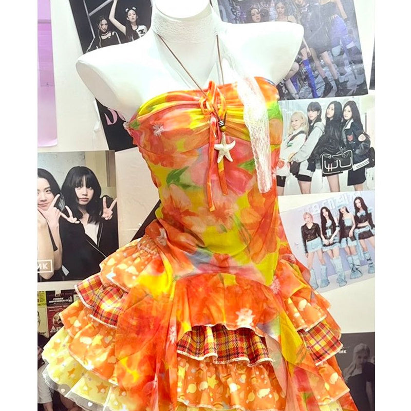 Halter contrast ruffle plaid patchwork mini skirt set