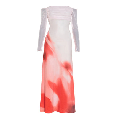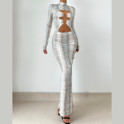 Hollow out long sleeve snakeskin print o ring cut out maxi dress