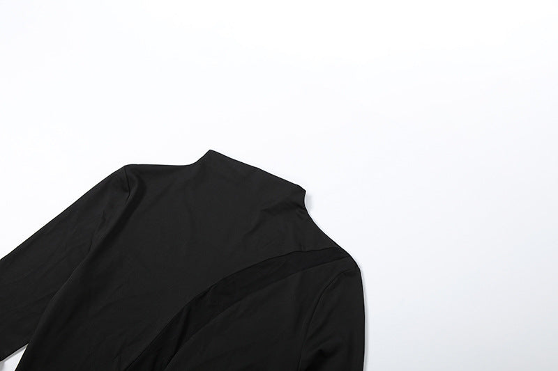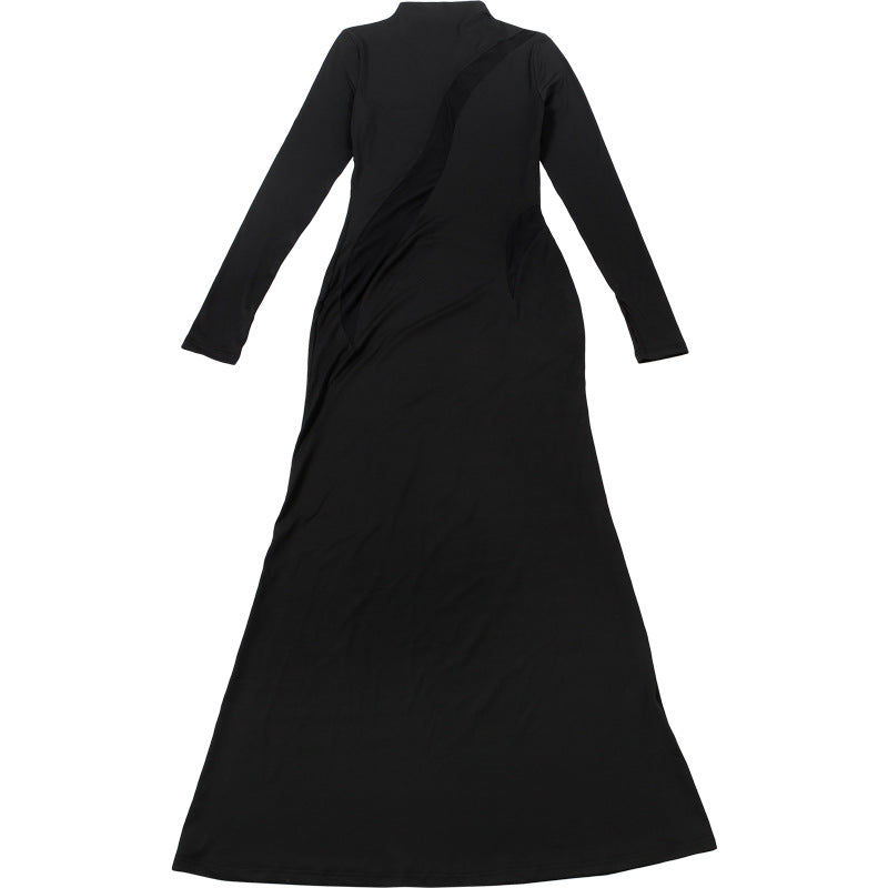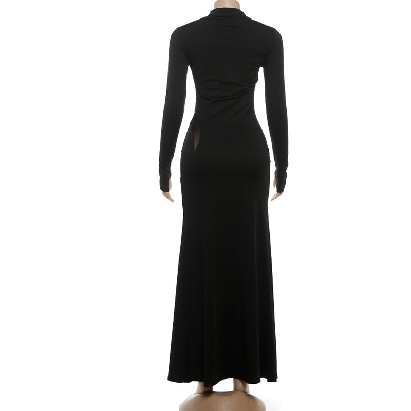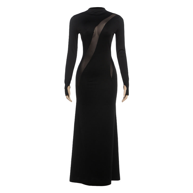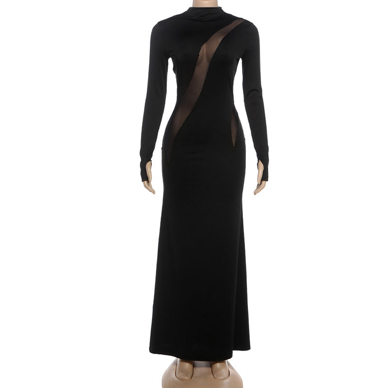 High neck long sleeve mesh patchwork maxi dress