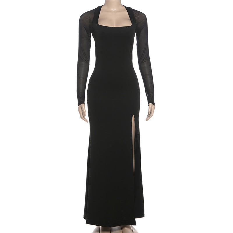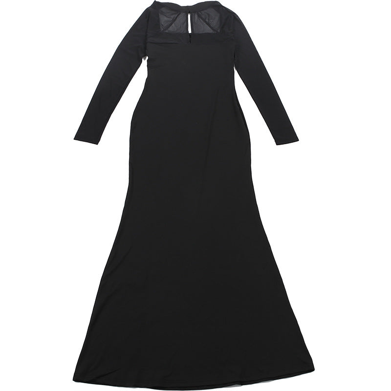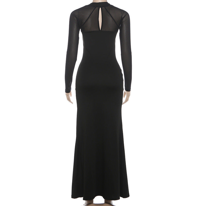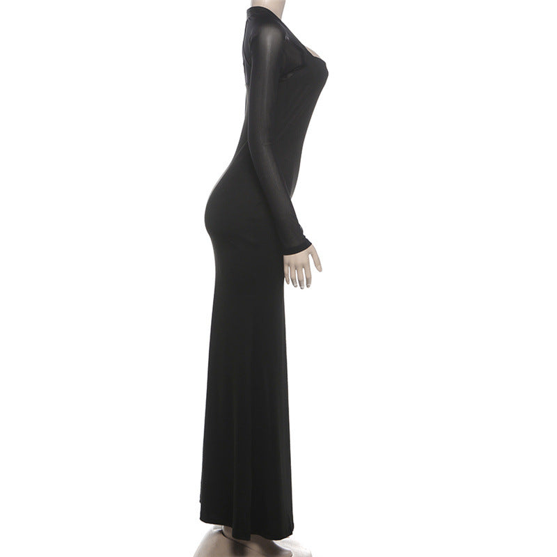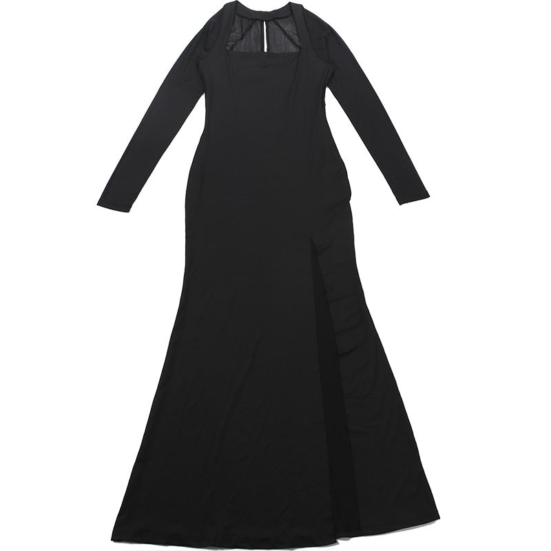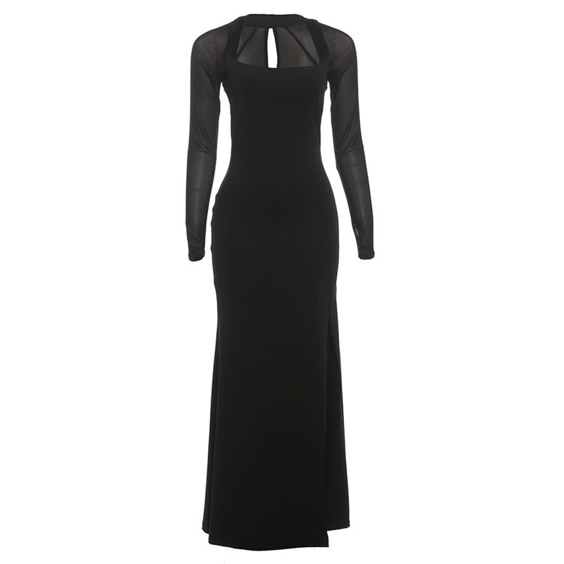 Long sleeve hollow out mesh high slit cut out maxi dress