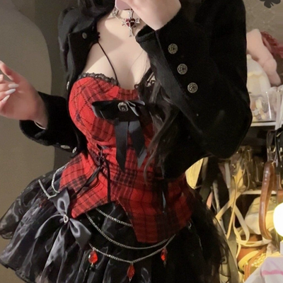 Long sleeve plaid 3 piece bowknot mini skirt set