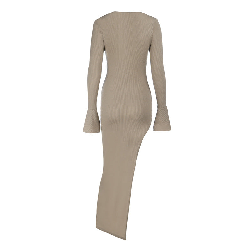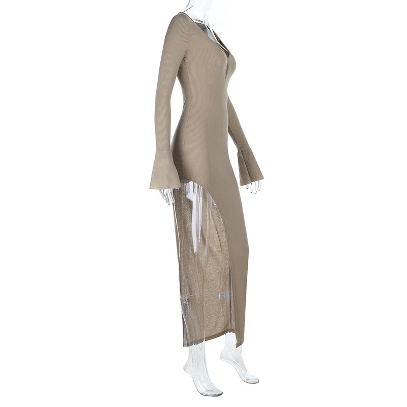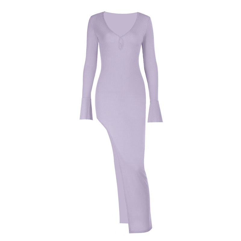 V neck long sleeve slit irregular maxi dress