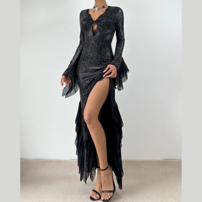 Long sleeve v neck lace hem snakeskin print maxi dress
