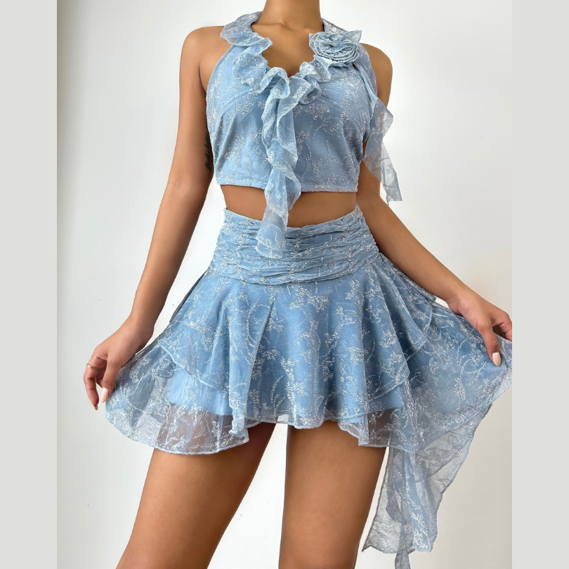 Halter flower applique ruffle irregular mini skirt set