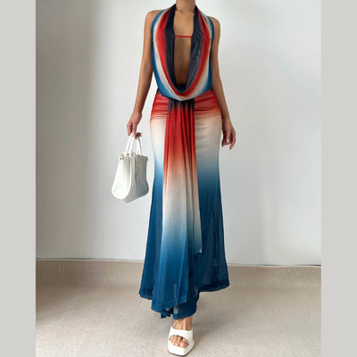 Cowl neck halter gradient backless maxi skirt set