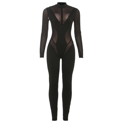 High neck long sleeve mesh patchwork jumpsuit