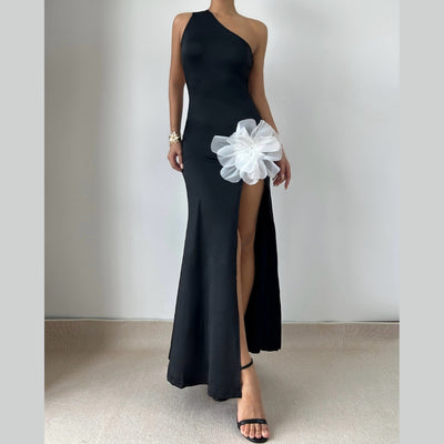 Flower applique one shoulder slit maxi dress