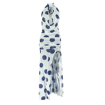 Halter high slit polka dot ruched mesh maxi dress