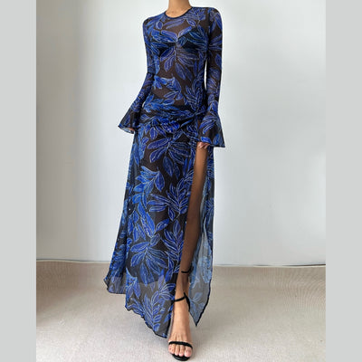 Long flared sleeve crewneck slit print mesh maxi dress