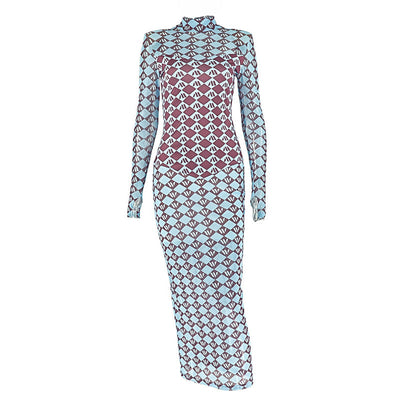 High neck long sleeve mesh print maxi dress