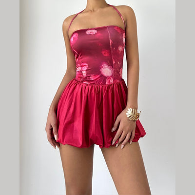 Halter flower print self tie ruched mini dress