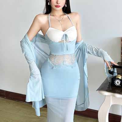 Halter ruched mesh lace patchwork maxi dress