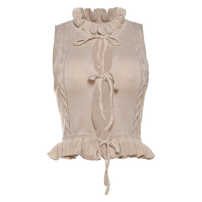 Sleeveless knitted ruffle self tie top