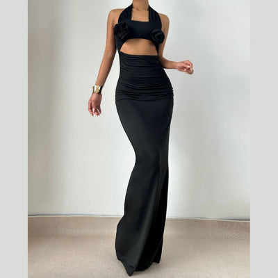 Halter flower applique hollow out cut out maxi dress