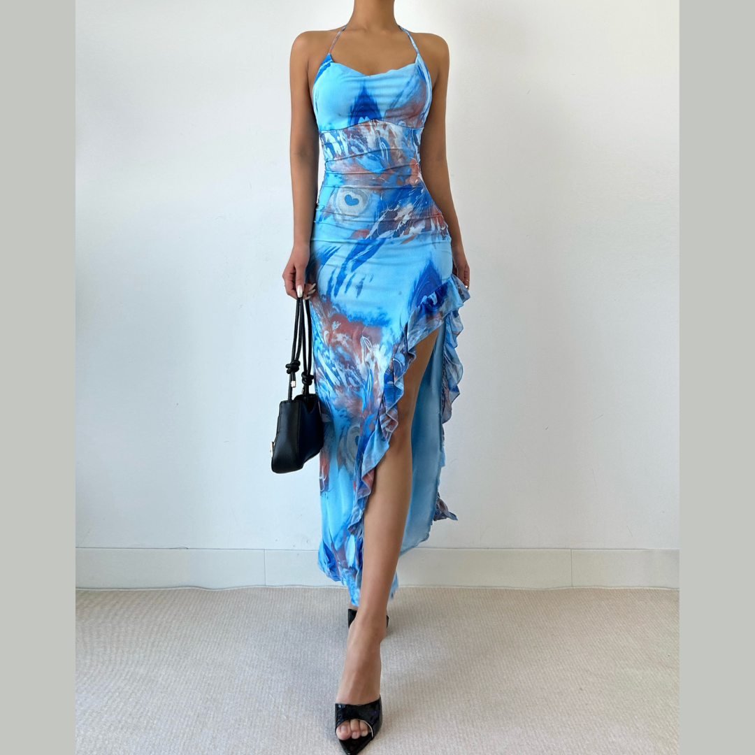 Ruffle slit print halter self tie cowl neck maxi dress | Festival Outfits Women