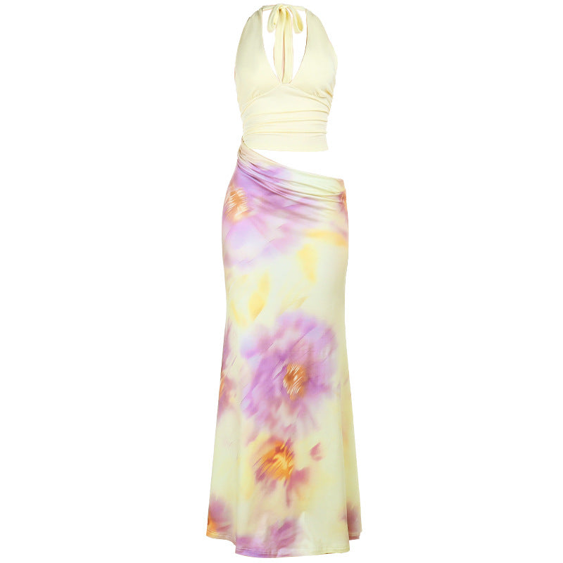 Hollow out v neck self tie halter flower print cut out maxi dress | Festival Outfits Women
