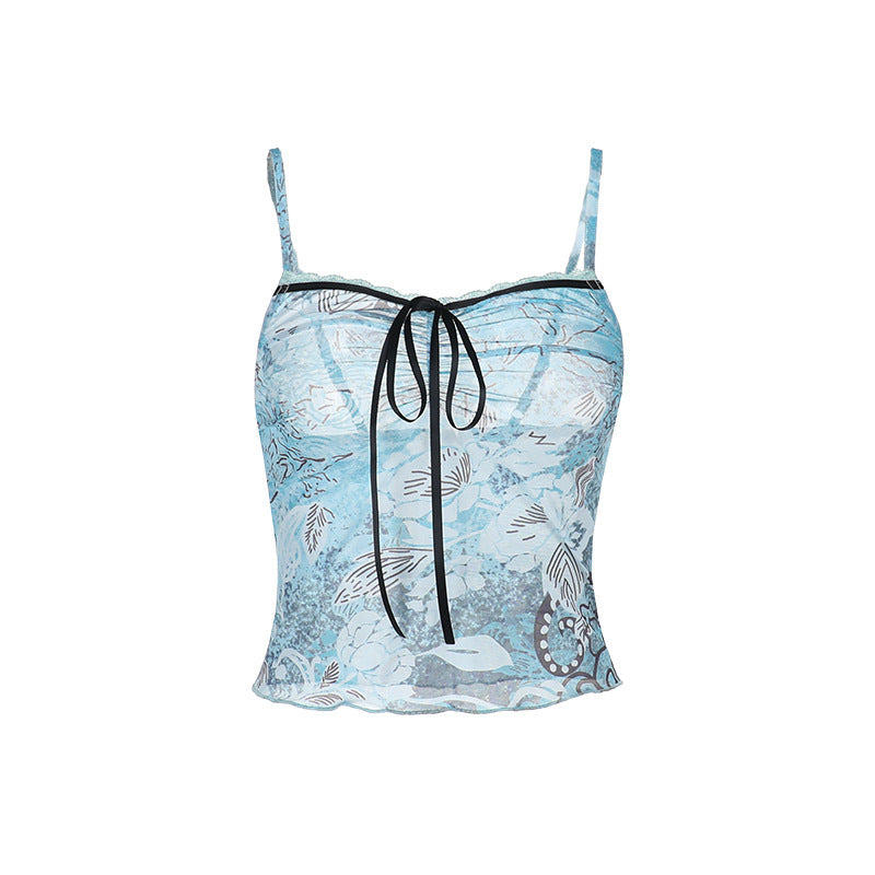 Lace hem self tie print mesh backless cami top | Festival Outfits Women