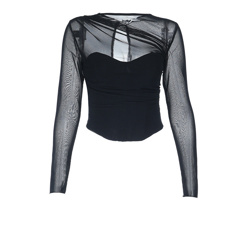 Long sleeve mesh zip-up crewneck solid top | Festival Outfits Women
