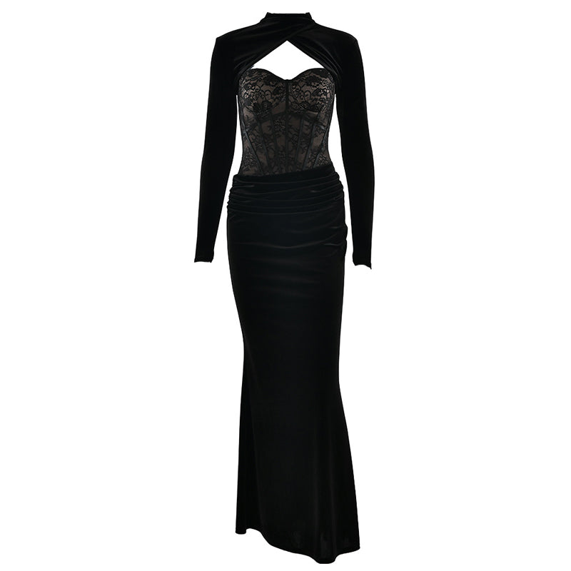 Long sleeve lace ruched zip-up solid maxi dress | Festival Outfits Women