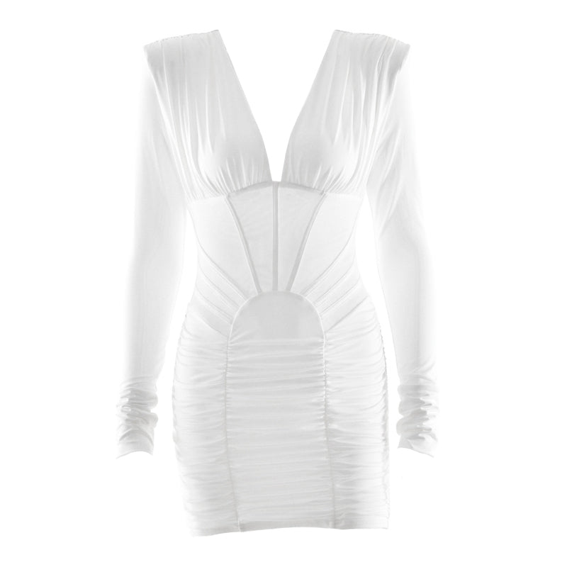 Long sleeve ruched v neck solid mini dress | Festival Outfits Women