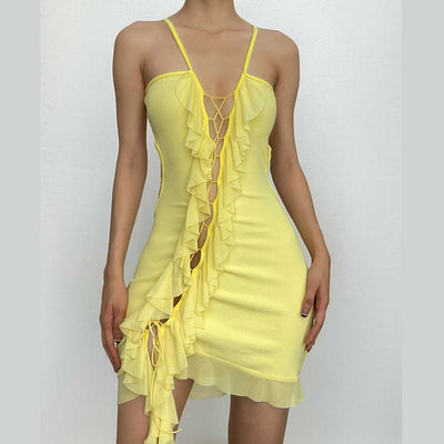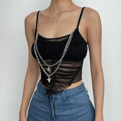 Buckle mesh ruffle halter backless low cut crop top