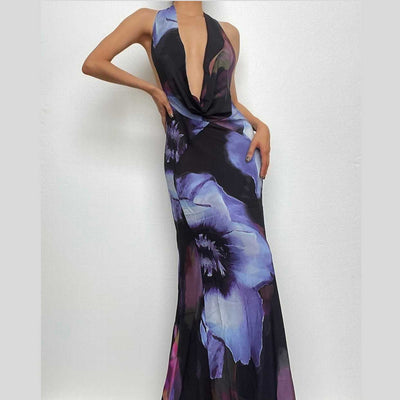 Halter drawstring sheer mesh see through slit backless maxi dress