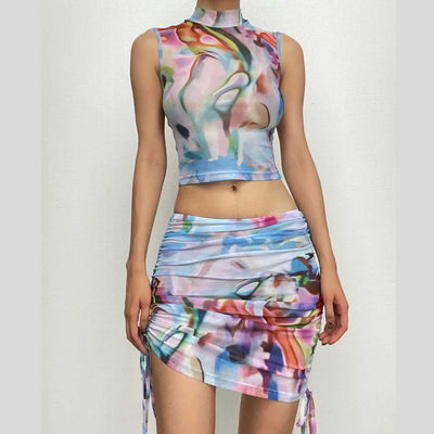 Backless self tie ruched tie dye drawstring contrast mini skirt set