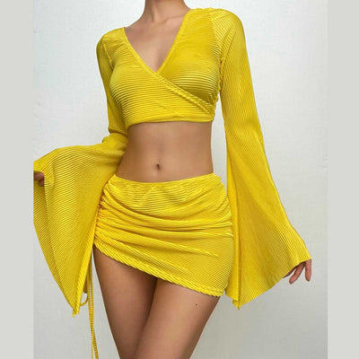Flared sleeve tie dye o ring self tie halter low cut mini skirt set