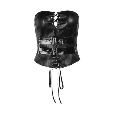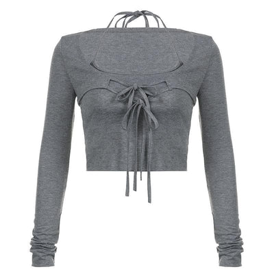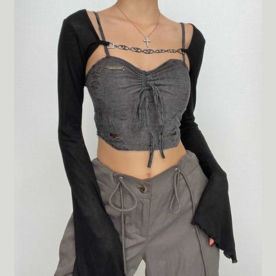 Fishnet patchwork off shoulder buckle long sleeve crop top