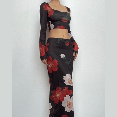 Ruched lace up lace hem patchwork square neck maxi skirt set