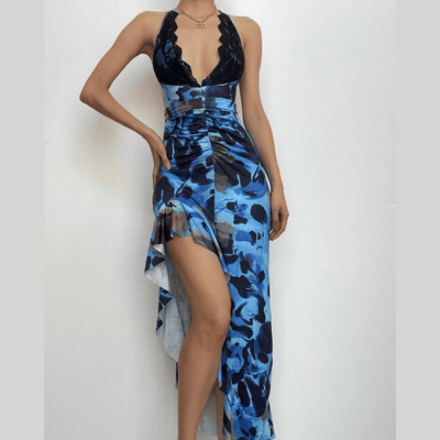 Irregular v neck backless contrast print cowl neck cami midi dress