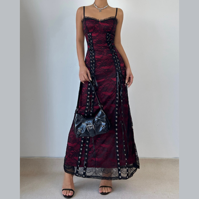 Ruffle lace up lace backless cami maxi dress
