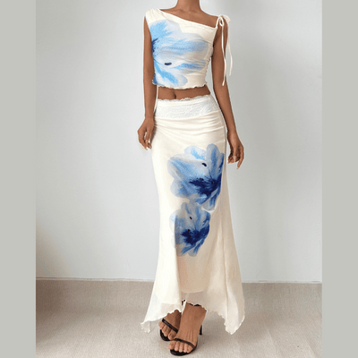 Off shoulder flower print lace hem maxi skirt set