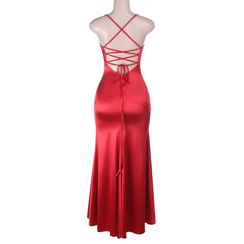 Cowl neck cross back lace up cami maxi dress