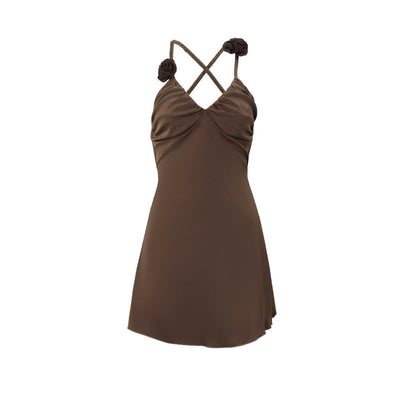 V neck cross back flower applique ruched cami mini dress