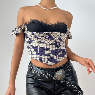 Off shoulder plaid print lace hem top