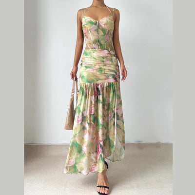 Halter self tie hollow out o ring slit print cut out maxi dress