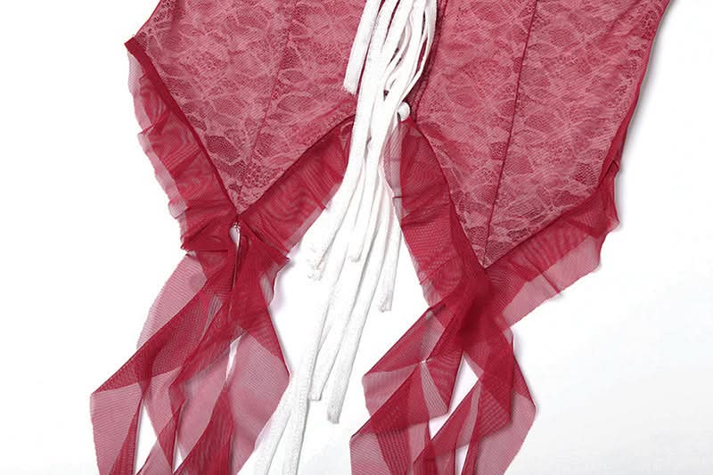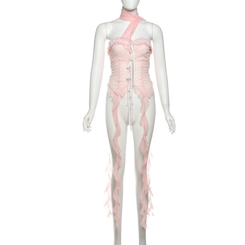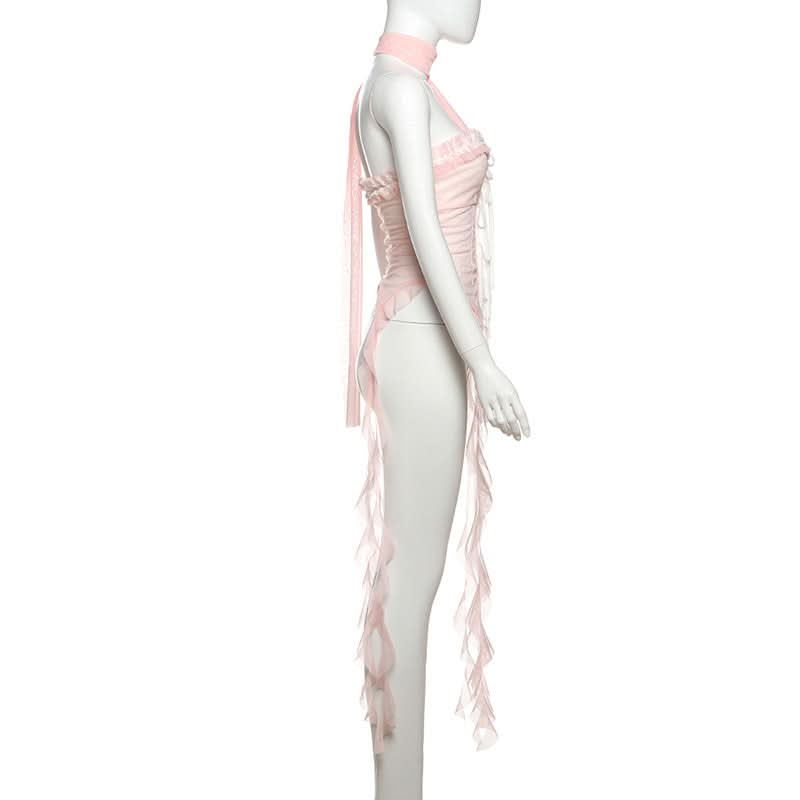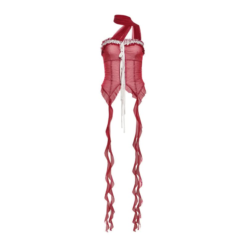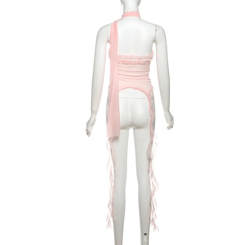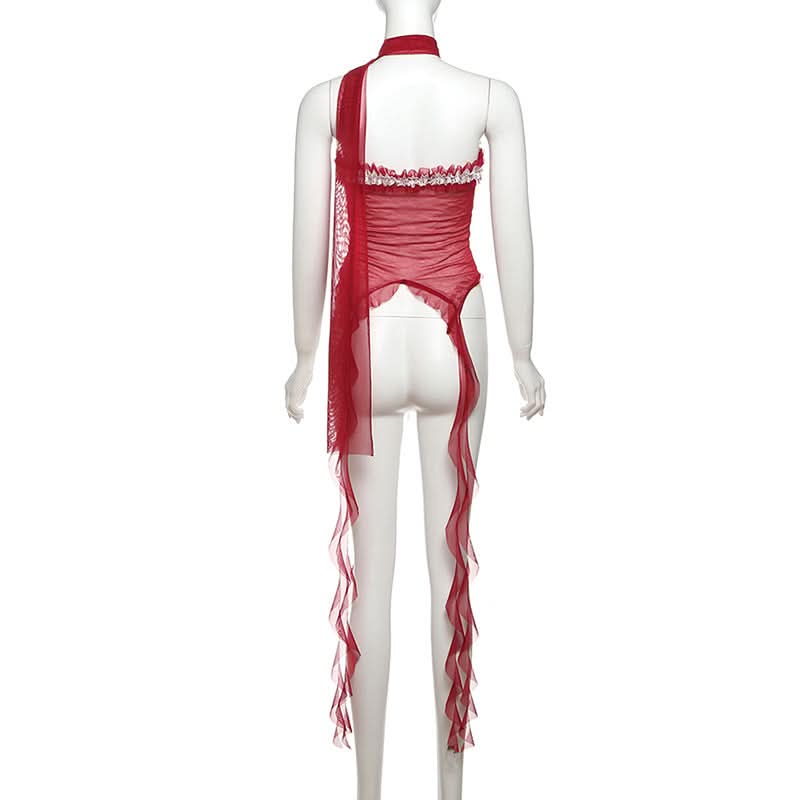 Halter ruffle mesh lace hem top
