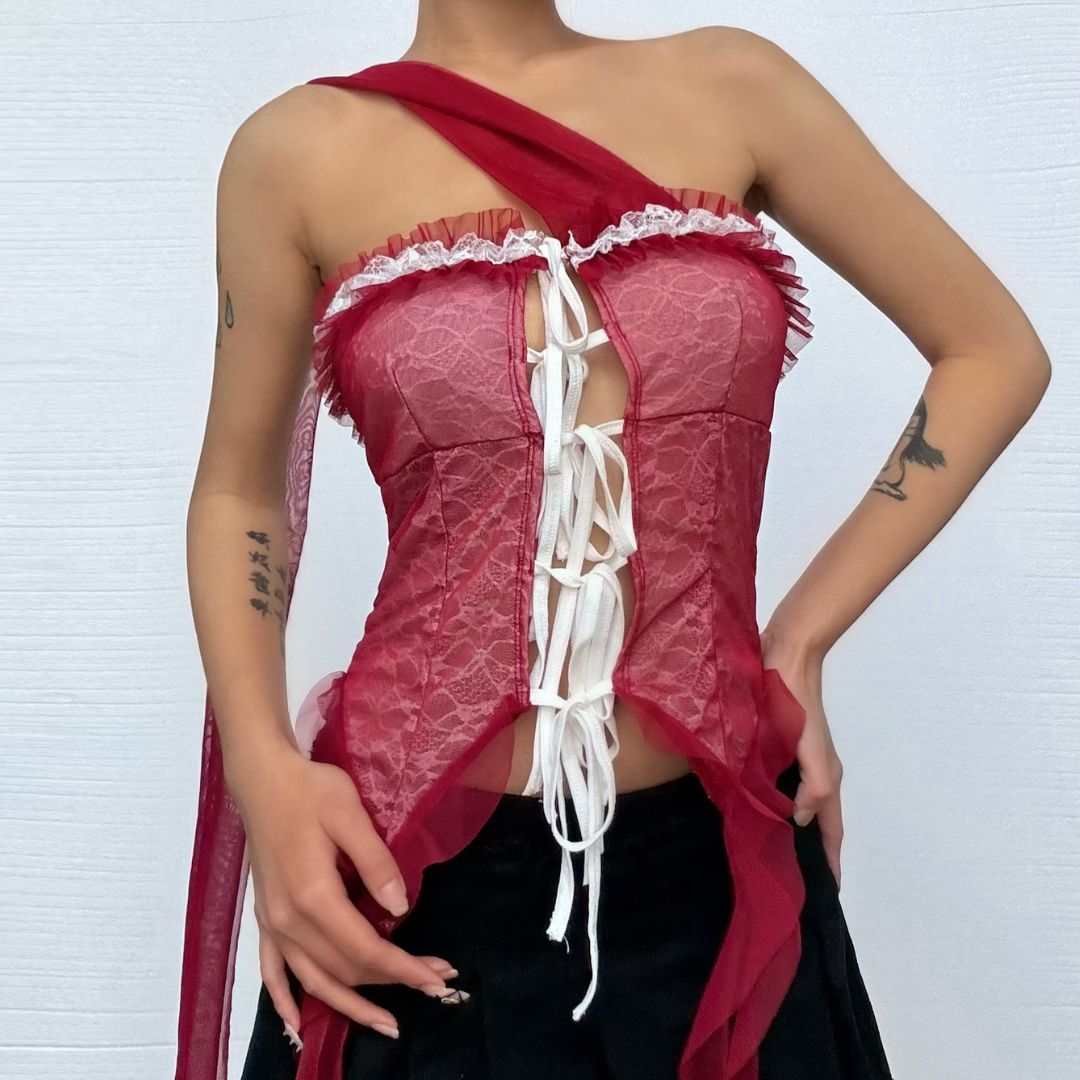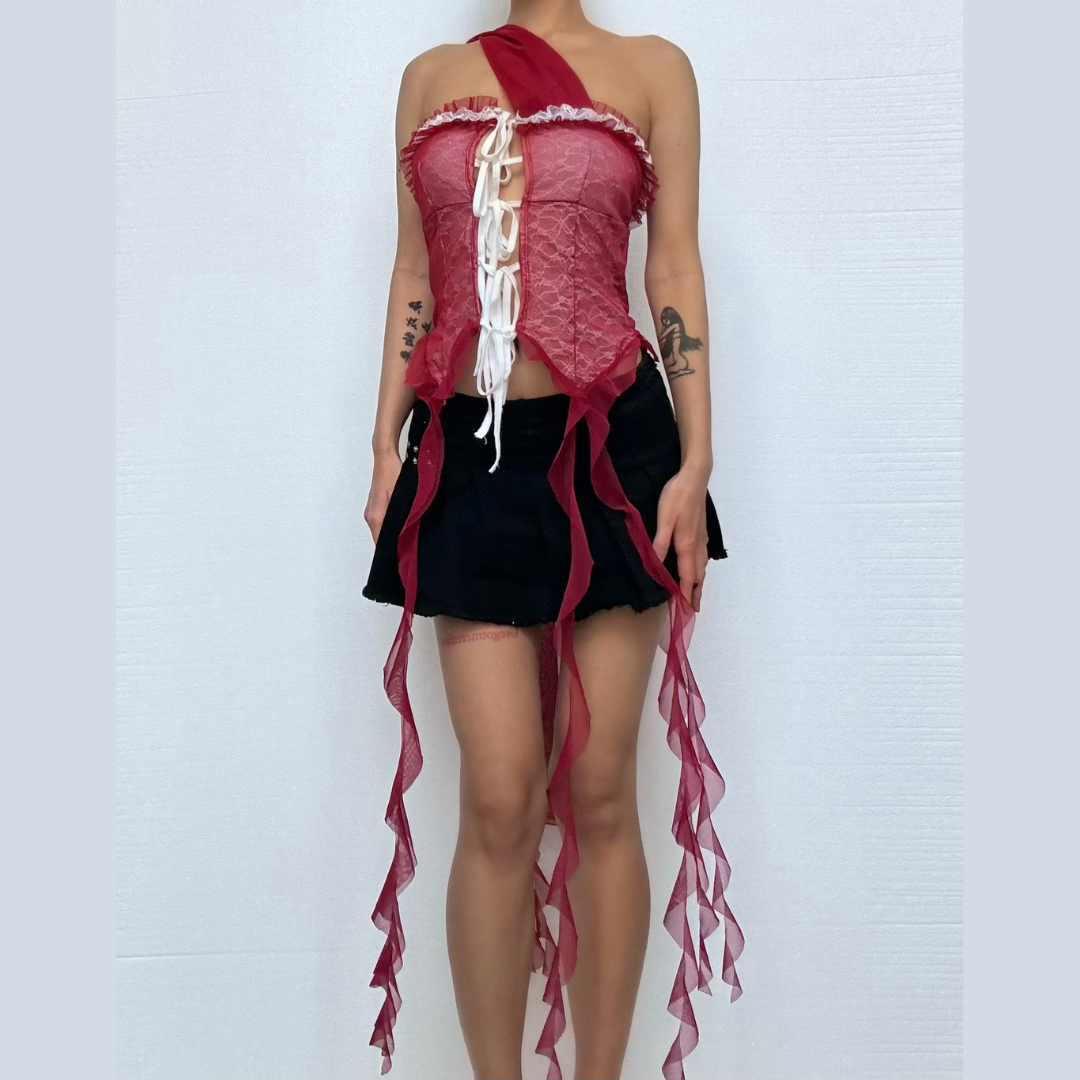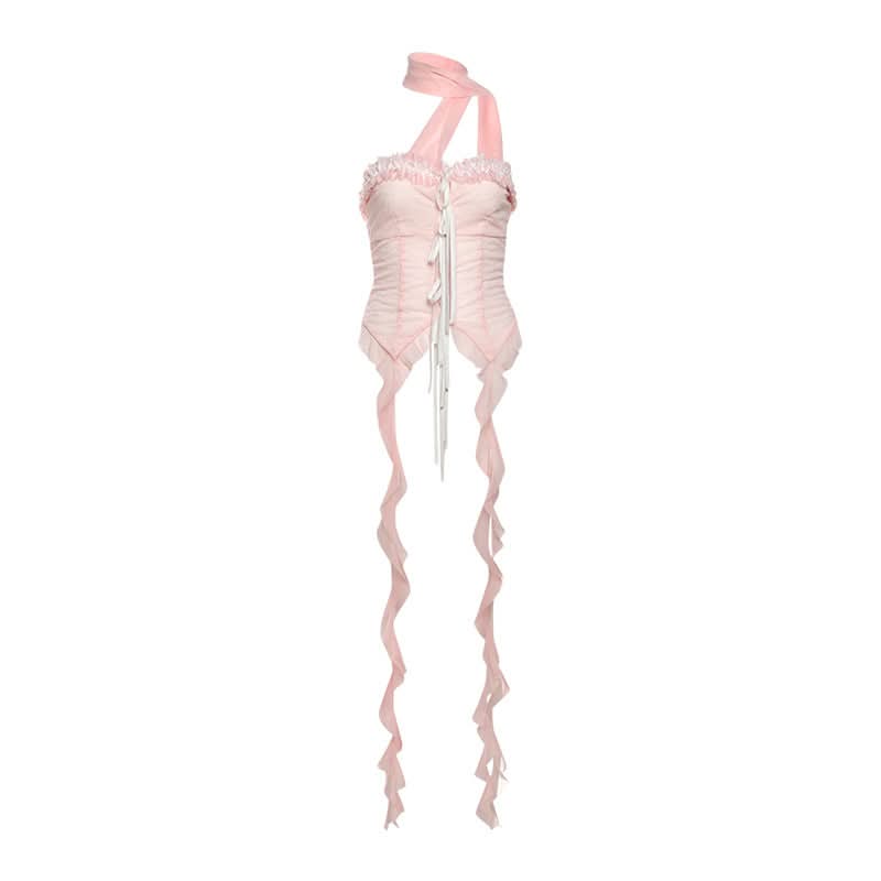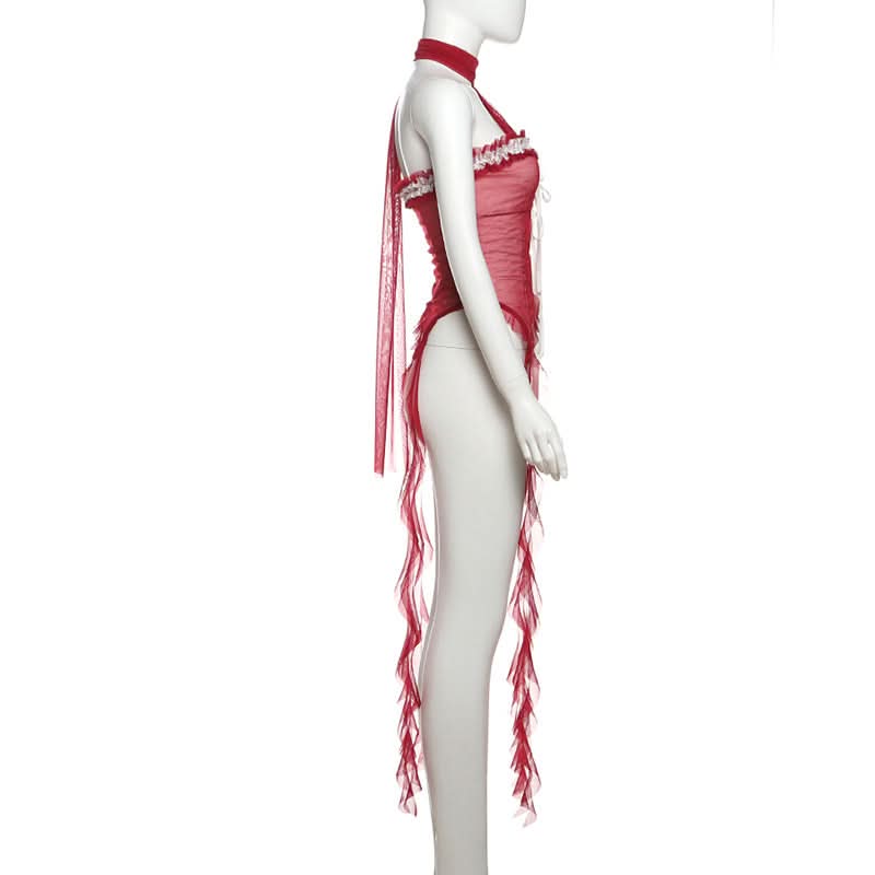 Halter ruffle mesh lace hem top