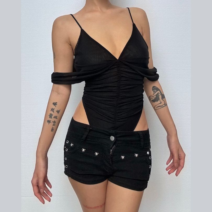 V neck off shoulder ruched bodysuit