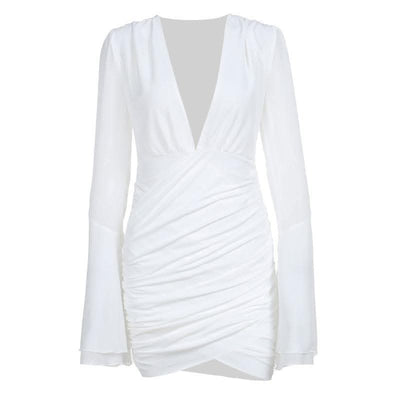 V neck long flared sleeve ruched irregular solid mini dress-final-sale